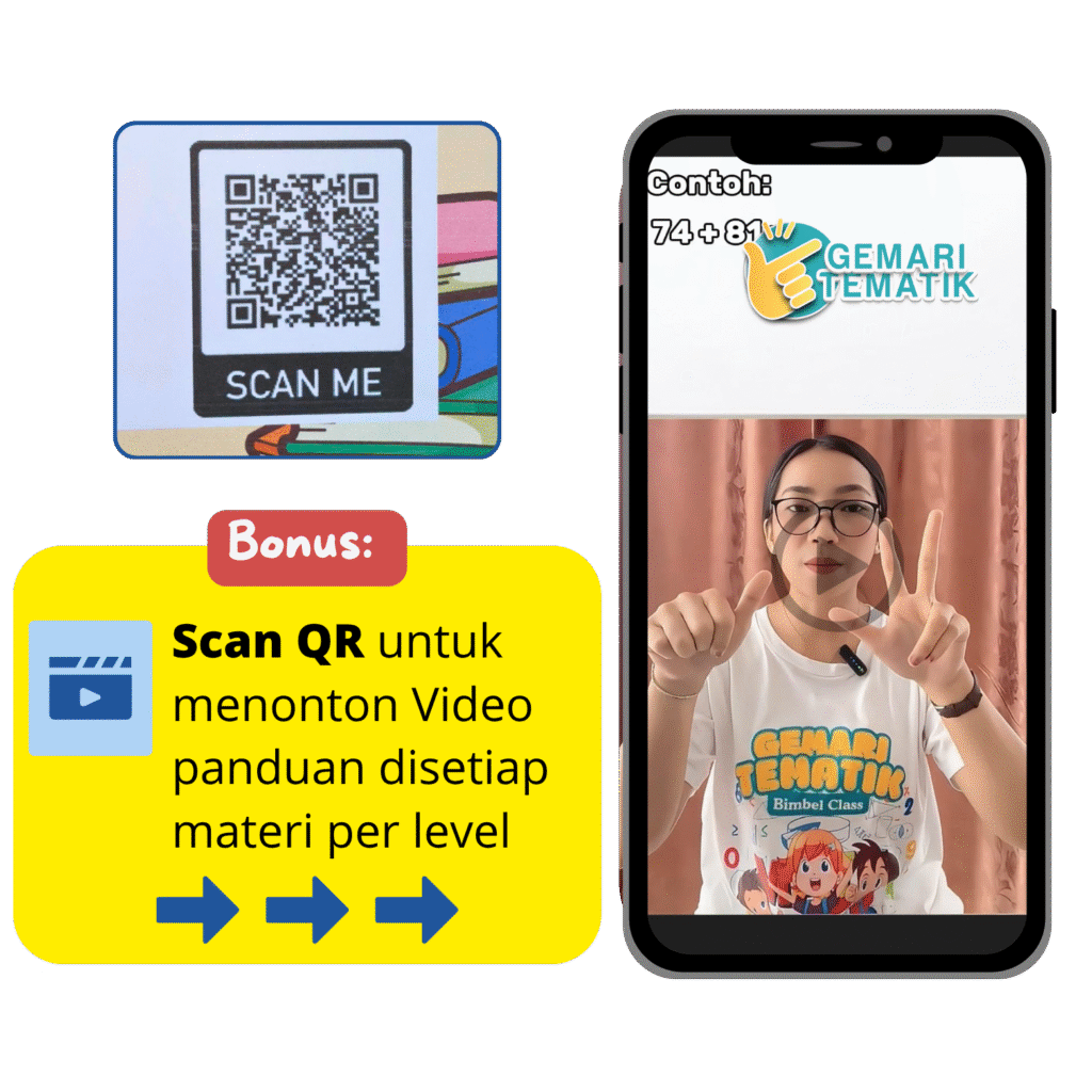 Buku Hitung Cepat Jarimatika Gemari Tematik  hadir dengan trik hitung cepat + video pembelajaran interaktif langsung dari QR Code.